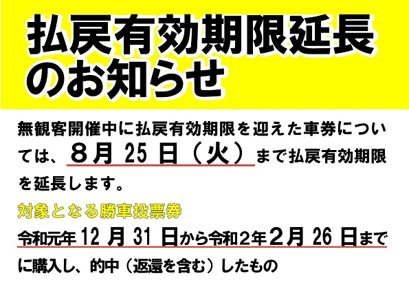無観客開催期間中に払戻有効期限を迎えた車券については、8月25日(火)まで払戻有効期限を延長します。