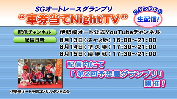 伊勢崎オートレース場では、「オッズパーク杯第24回オートレースグランプリ」の後半三日間、伊勢崎オート公式YouTubeチャンネルでの初の試み、「車券当てNight TV」の生配信を行います。