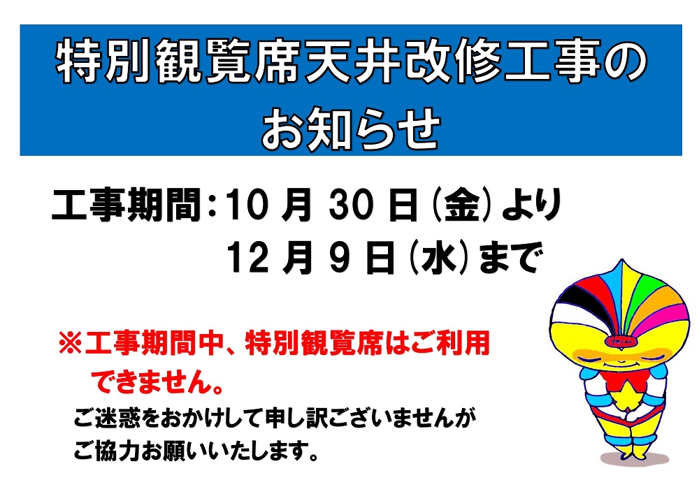 特別観覧席の天井改修工事のため、10月30日(金)~12月9日(水)(予定)の期間中に工事を行います。