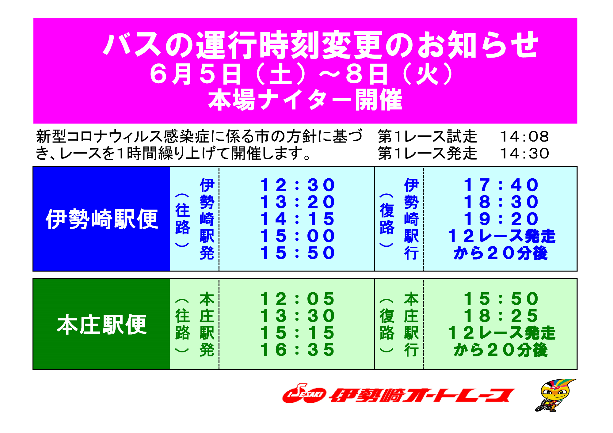 新型コロナウィルス感染症に係る市の方針に基づき、レースを1時間繰り上げて開催します。
