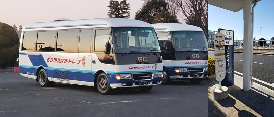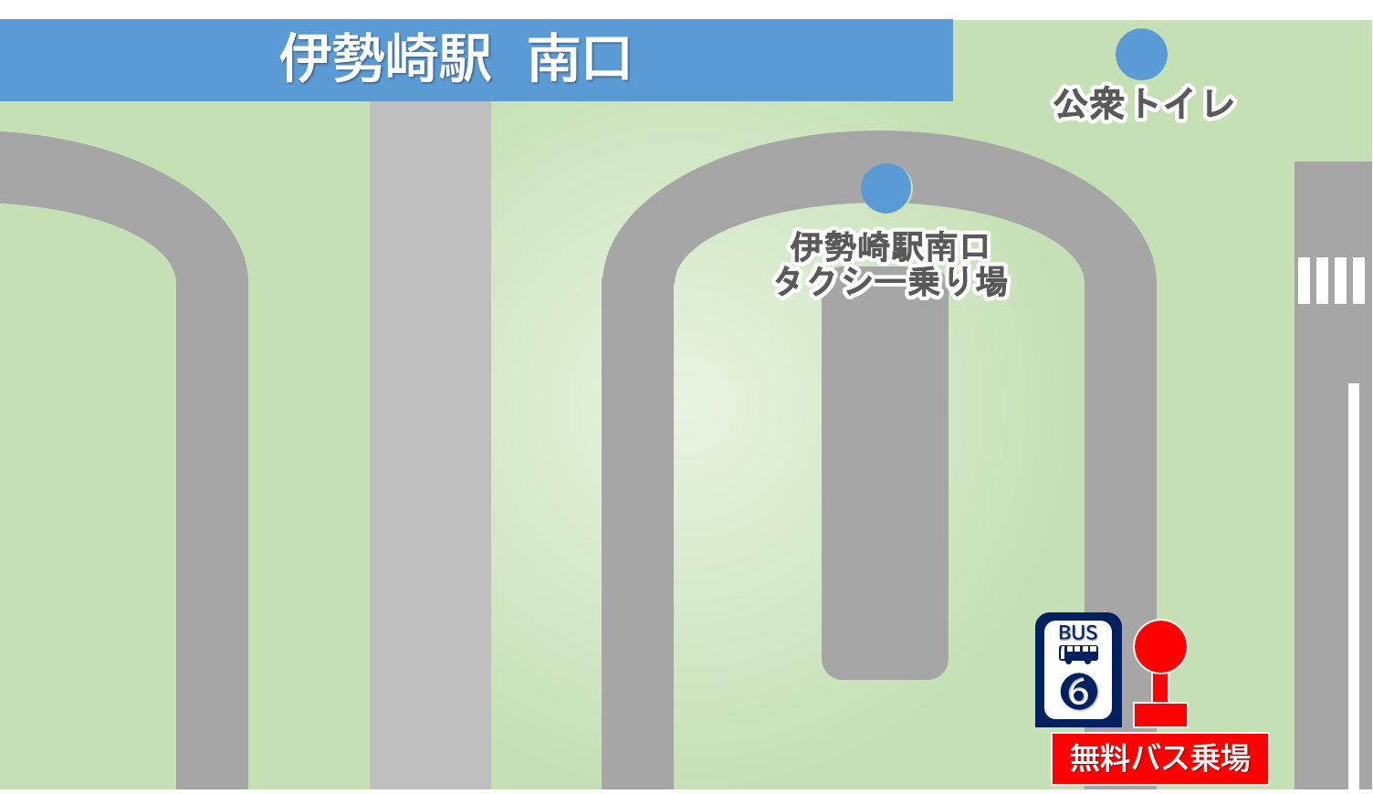 伊勢崎駅より駅前信号方面に徒歩2分ほどに、無料バス乗り場があります。