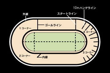 内側に少し傾斜した1周500メートル、幅30メートルのオーバルコース(楕円の競走路)を通常8車で左回りに6周して順位を競い合います
